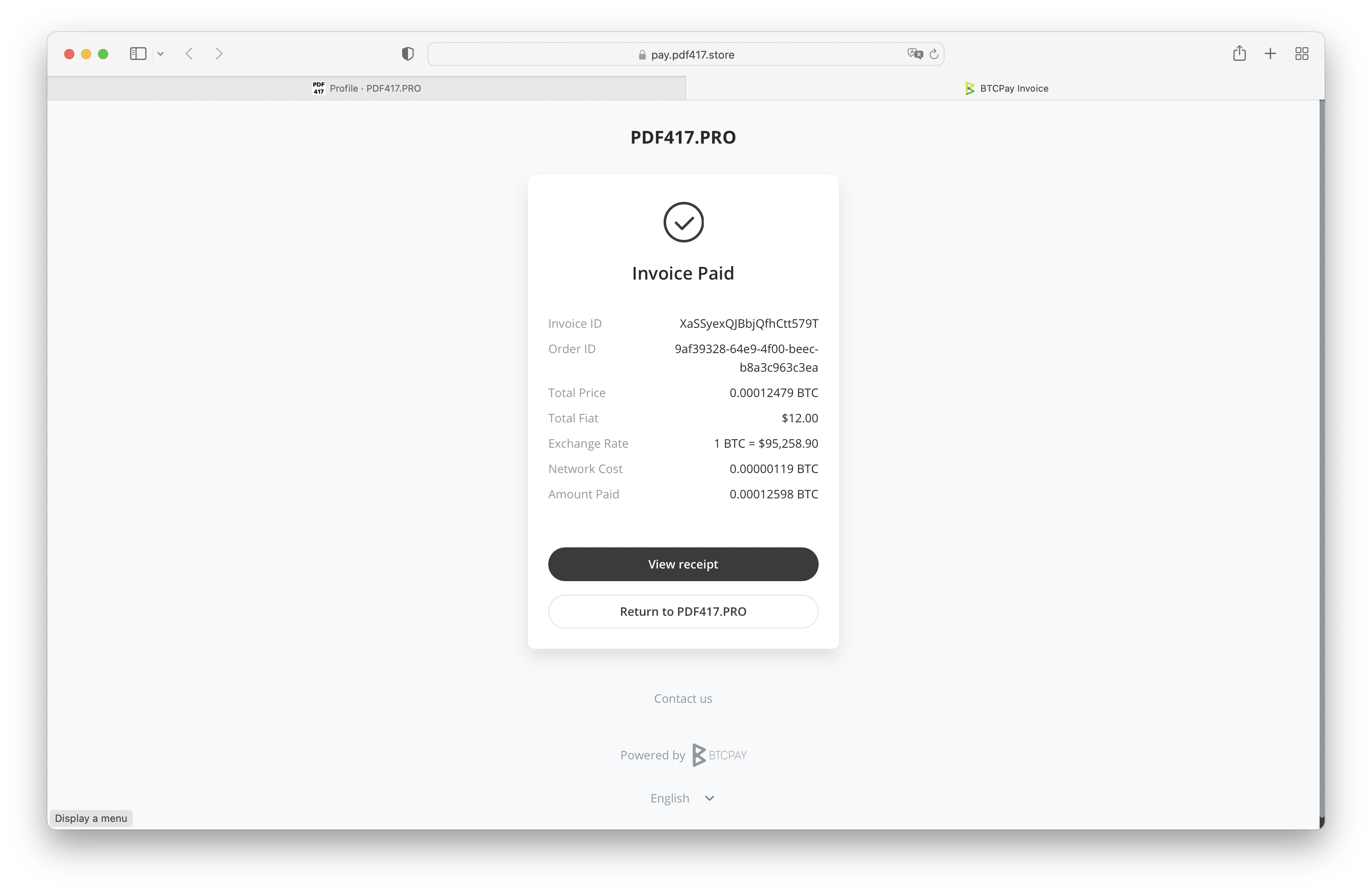 You will be redirected to the BTCPay invoice page.